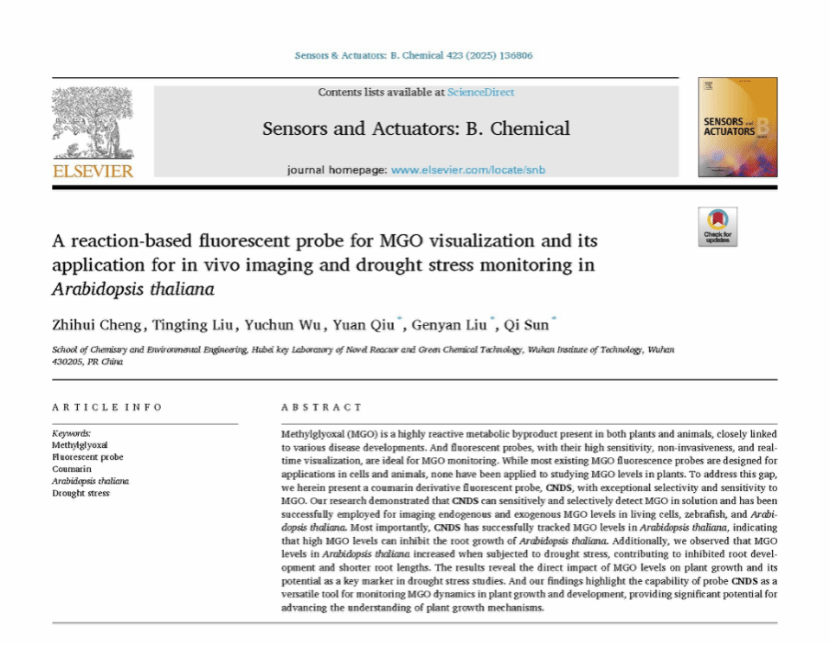 本网讯(通讯员 徐志强)近日,yl34511线路中心化学工程与工艺专业2021级本科生程智慧以第一作者在国际知名期刊Sensors and Actuators: B. Chemical(中科院一区TOP期刊,影响因子8.0)发表了题为《A reaction-based fluorescent probe for MGO visualization and its application for in vivo imaging and drought stress monitoring in Arabidopsis thaliana》的学术论文。yl34511线路中心为唯一署名单位,yl34511线路中心药物先导与功能分子团队刘根炎教授与孙琦副教授为论文共同通讯作者。