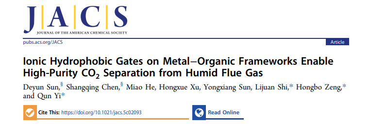 近日,课题组与加拿大阿尔伯塔大学曾宏波院士团队在《美国化学会志》(Journal of the American Chemical Society)合作发表重要研究成果,通过在固体吸附剂表面构建“离子疏水门控”(IHG),成功实现潮湿烟气中直接获取高纯度CO2,为工业碳减排提供了可行方案。博士研究生孙德贇、陈尚清老师为论文共同第一作者,史利娟教授、加拿大阿尔伯塔大学曾宏波院士、易群教授为论文共同通讯作者。图1. 离子疏水门控设计示意图该研究通过